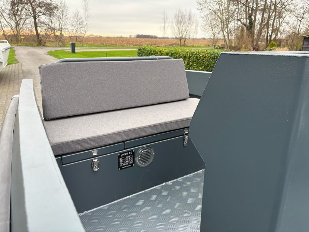 De afgelaste vloer vormt een luchtkast die bijdraagt aan drijfvermogen en veiligheid. De traanplaatvloer is uitgevoerd met twee loospluggen, waarmee regen- en spatwater eenvoudig kan worden afgevoerd wanneer de boot stilligt.