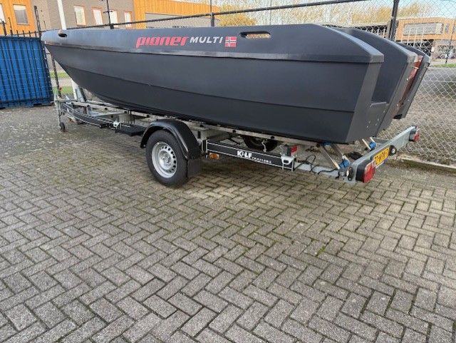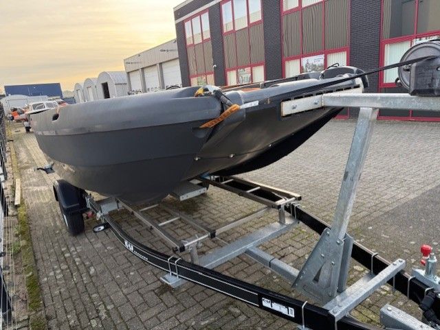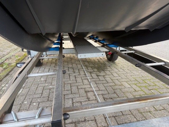 Uitgevoerd met motorbootpakket: een AK901 zelfremmende lier, 6 rubberen kielrollen en 4 rubberen kimrollen.
